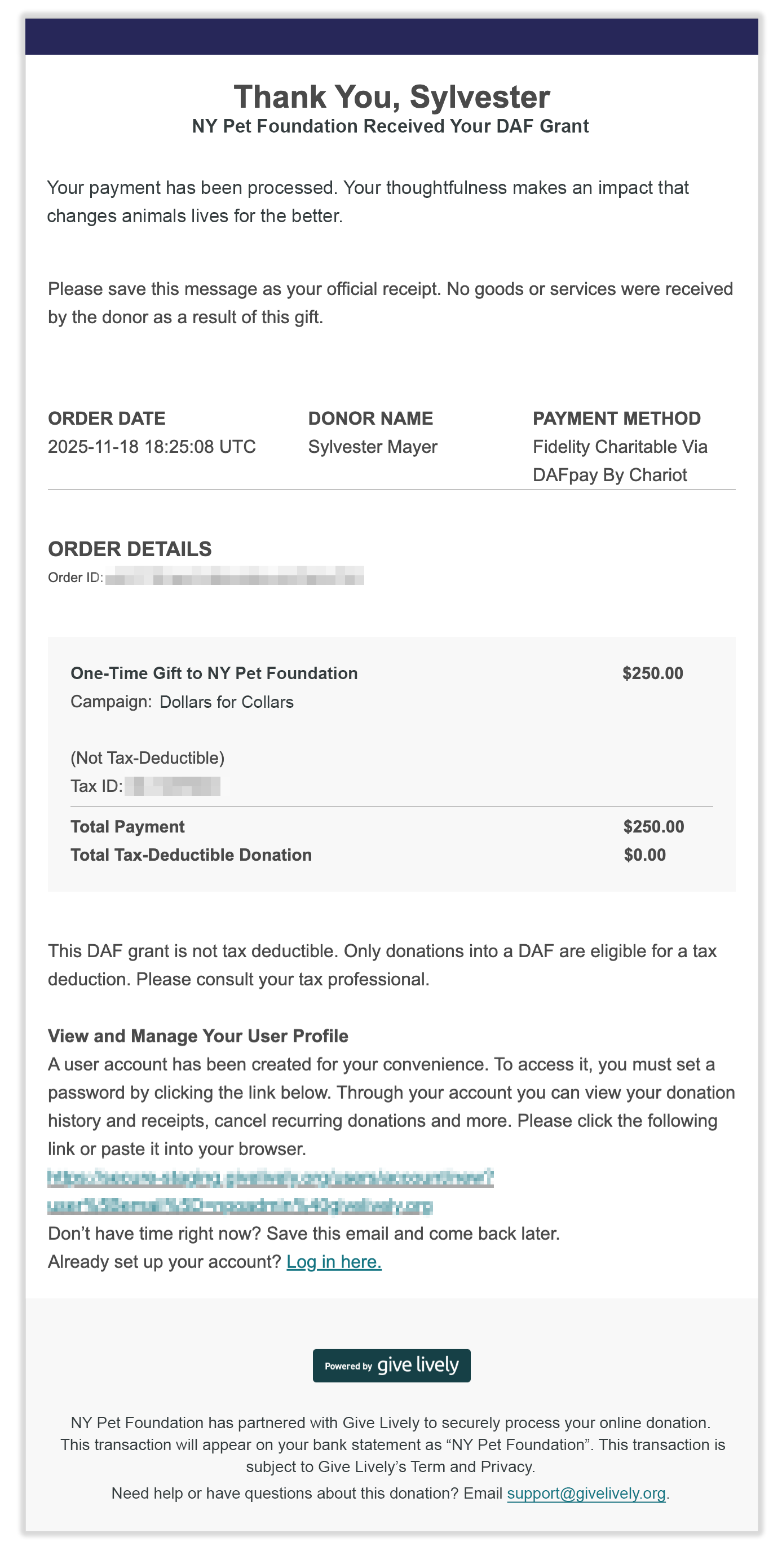 - Once the grant is marked as received by the nonprofit, donors receive the following email confirmation receipt, which makes clear that only donations to DAFs are eligible for a tax deduction, not DAF grants to nonprofits.