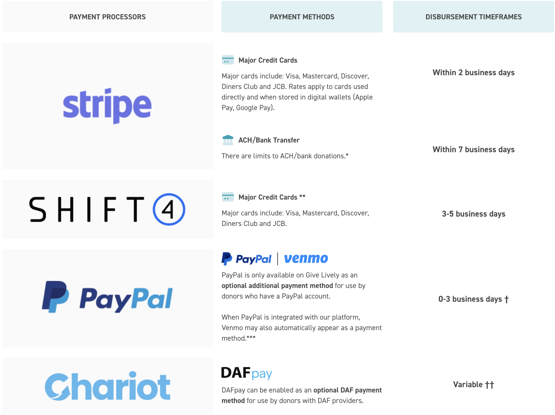 ** At present, the Shift4 integration on Give Lively is available for one-time card donations, with recurring donations and expanded payment methods to come. Until then, all other Give Lively payment methods remain available to donors, but are handled by Stripe or PayPal. Once the Shift4 integration has expanded to cover other donation frequencies and methods available through Stripe, nonprofits will be able to choose between Shift4 and Stripe for each type of payment method. Learn more about Shift4 + Give Lively.