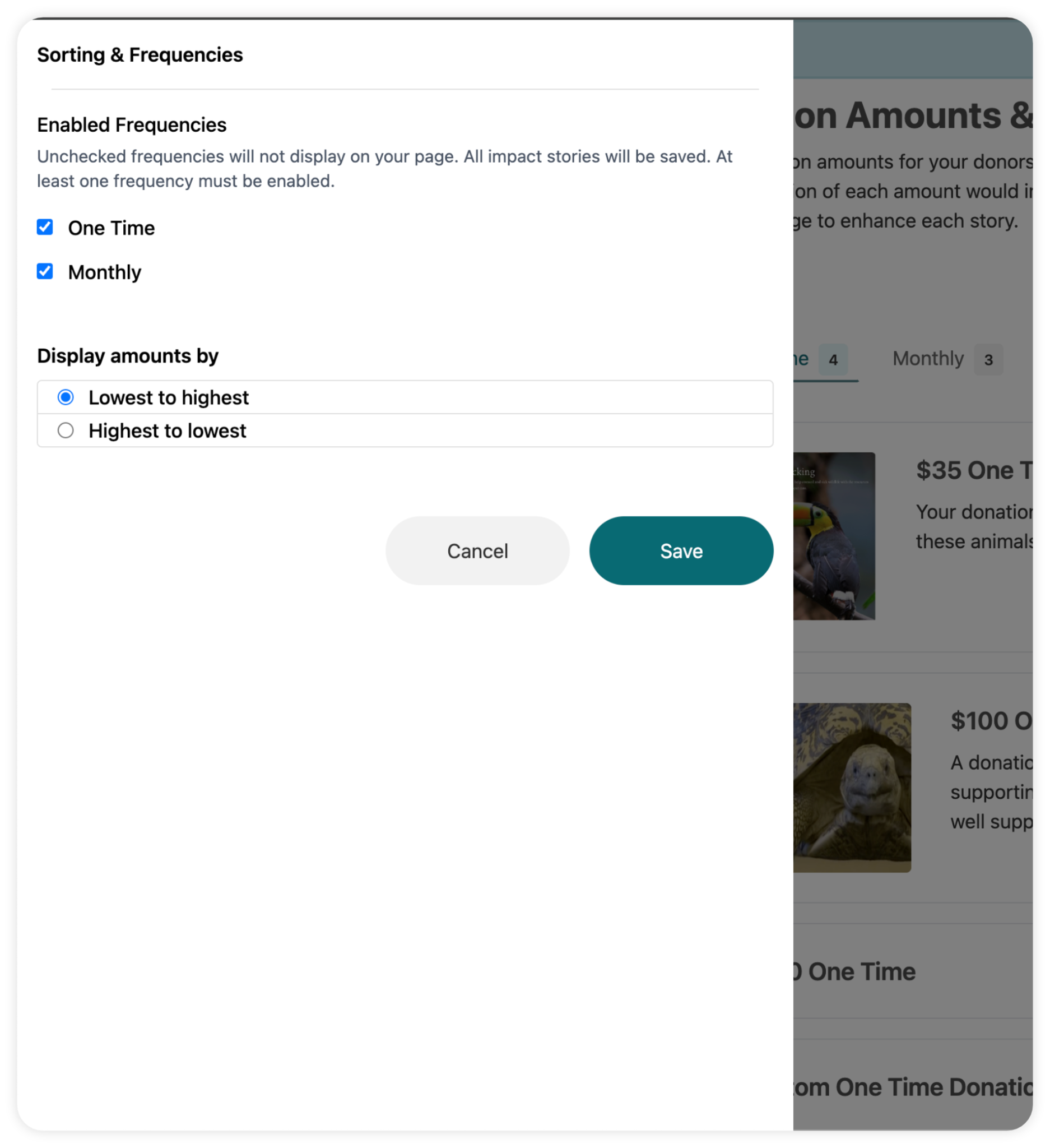As a final step, you can click on the “Sorting & Frequencies” option next to the “Create New” button to have further control over what donation options are shown to donors when they land on your page. You can turn off one particular frequency if you find it unnecessary for your Campaign, and also have the display amounts appear in different orders.