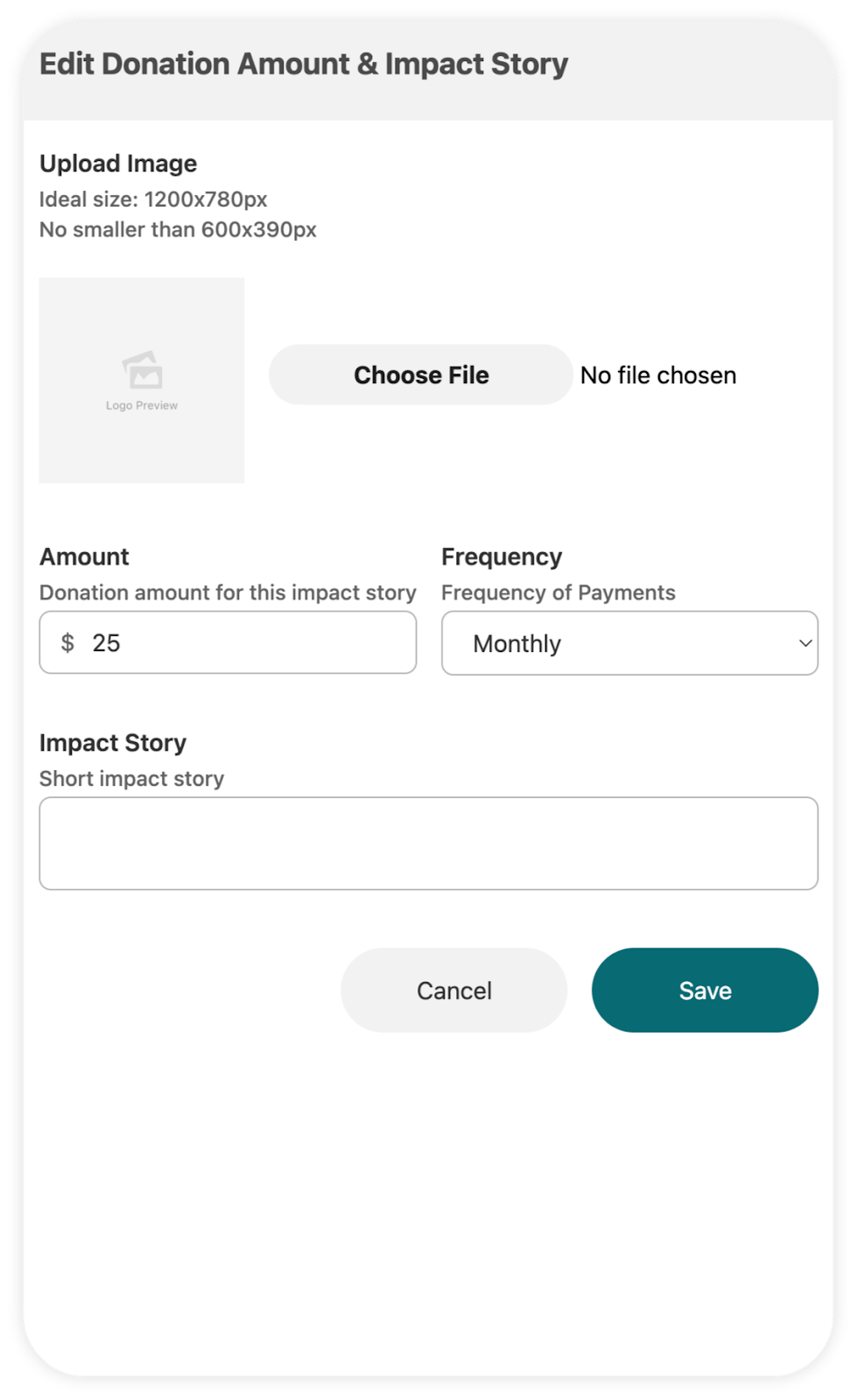 Whether editing an existing suggested amount or creating a new one, you will be able to upload your own JPG or PNG to go along with your impact story. The ideal image will be 1200x780px PNG image, but it should be no smaller than 600x390px.Â